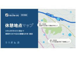 株式会社ナビタイムジャパンは11月7日、トラック専用カーナビアプリ「トラックカーナビ」で、ユーザーが口コミ情報とともに休憩地点を投稿しあえる「休憩地点マップ」を提供開始すると発表した。