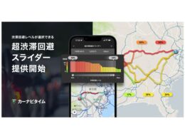 株式会社ナビタイムジャパンは8月9日、カーナビアプリ「カーナビタイム」で渋滞回避レベルの異なる複数の渋滞回避ルートをユーザーが選択できる「超渋滞回避スライダー」を提供開始すると発表した。