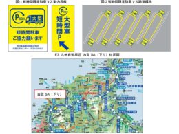 西日本高速道路株式会社九州支社(以下、NEXCO 西日本)は11月27日、E3九州自動車道 古賀サービスエリア(SA)の下り 福岡方面で、短時間限定駐車マスの実証実験を11月27日より開始すると発表した。昨今、都市近郊部を中心としたSA・PAでは、長時間駐車の車両割合が多く、依然として混雑。