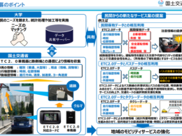 国土交通省は、民間企業データとETC2.0データを活用した新しいサービスの提案について募集することを発表した。ETC2.0データは、道路上に設置された路側機と各車両に設置されたETC2.0車載器との間の相互通信により得られるもので、車両の基本情報、走行履歴情報、挙動履歴情報から構成されている。