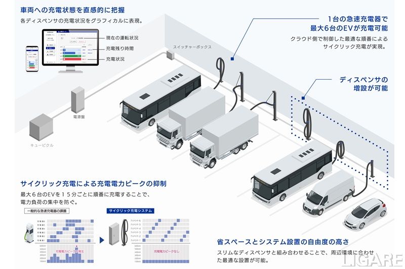 これらの複合的な課題に対し、ニチコンの提示した解決策が「サイクリックマルチ充電器」だ。そのコンセプトは「1台のパワーユニットで、最大6台のEVを賢く順次充電する」というもの。これにより、設備コストと電力ピークを抑制できる。