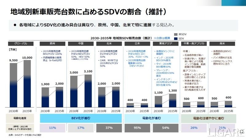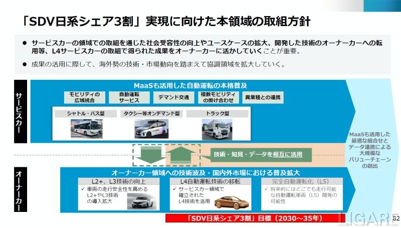 一方で、自動運転やSDVの分野では、状況が異なる。レベル3自動運転の市販車を日系メーカーが世界で初めて開発するなど、先行している部分があった半面、現在では無人運転のレベル4自動運転タクシーなど米国、中国のスタートアップに後れを取っている。SDVでは、統合されたソフトウェアを搭載したモデルが出始めていて、次の競争力の軸はソフトという意識は国内メーカー各社に浸透している。だが、SDVでこれまでの世界シェア3割を保っているかというと、そういうわけではない。だからこそ、「戦略」では、SDVでも従来の自動車と同様にシェア3割を数値目標として、取り組んでいる。