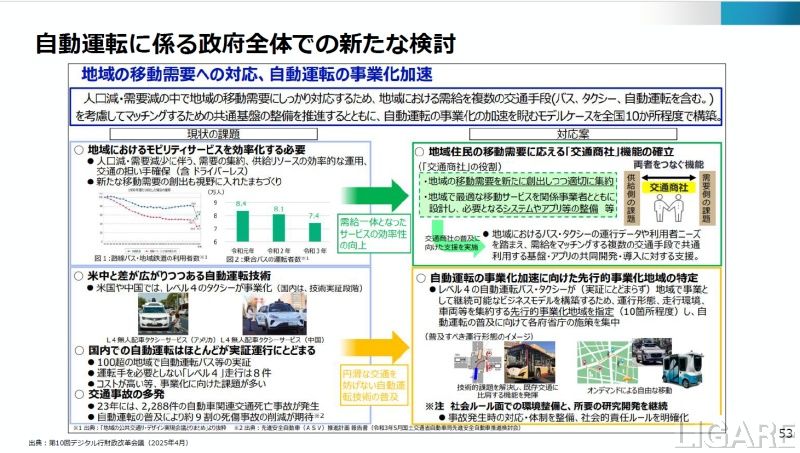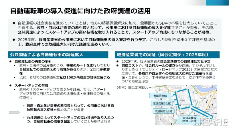 バス路線であったり、新東名高速のトラック走行であったり、決まったルートを走り、走行環境が安定していると実装しやすいという判断で、商用車が先行している。自動運転タクシーでも商用車でも世界に展開可能なビジネスモデルの早期確立に向けて「戦略」を推進する。加えて国内では、人手不足に起因する公共交通・物流網の維持が社会課題としてあり、その解決策としての意義も大きい。「自動運転車やSDVが社会にとって有益で自分も使ってみよう」と人々に感じてもらえる受容性の醸成に省庁をまたいで取り組んでいる。