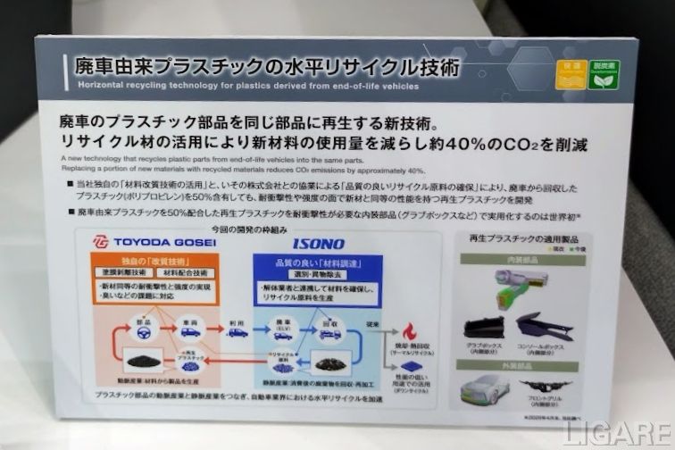 自動車の再生プラスチックの流通量が拡大する一方で、自動車の廃プラスチックの再生は、不純物の混入などにより新材と同等の性能を得るのが難しいという課題を抱えている。そのような課題を解決するために、豊田合成は、プラスチックのリサイクル事業を手掛ける、いその社と協業し、品質の良いリサイクル原料を確保すると共に、豊田合成独自の材料改質技術を活用することで、廃車から回収したプラスチック(ポリプロピレン)を50%含有しても新材と同等の性能を持つ再生プラスチックを開発、自動車部品の品質基準で実用化した。豊田合成は、この技術により、同じ部品に再利用する水平リサイクルを加速させ、CO2削減に貢献するという。リサイクルできないときは