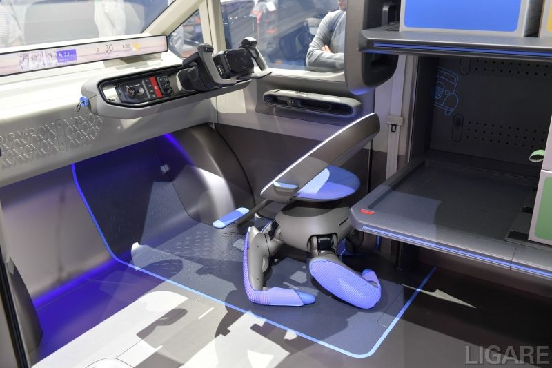 今回展示されたKAYOIBAKOは、フットペダルが設けられておらず、ハンドルだけで運転操作をできる設計となっている。この仕様により、足に障害があるドライバーでも運転が可能になる。普段使用するパーソナルモビリティがそのまま運転席として格納される、ユニバーサルデザインの発想も盛り込まれている。