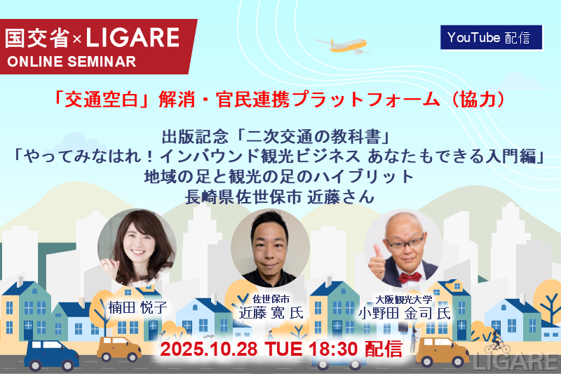 【自治体モビリティテックセミナー】国土交通省×LIGARE「交通空白」解消・官民連携プラットフォーム(協力) 「出版記念「二次交通の教科書」「やってみなはれ!インバウンド観光ビジネス あなたもできる入門編」 地域の足と観光の足のハイブリット 長崎県佐世保市 近藤さん」 2025年10月28日(火)開催