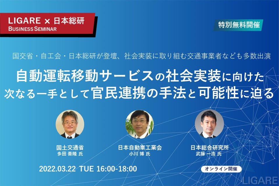 【特別無料開催】国交省・自工会・日本総研が登壇「自動運転移動サービスの社会実装に向けた次なる一手として官民連携の手法と可能性に迫る」社会実装に取り組む交通事業者なども多数出演 3月22日(火)開催