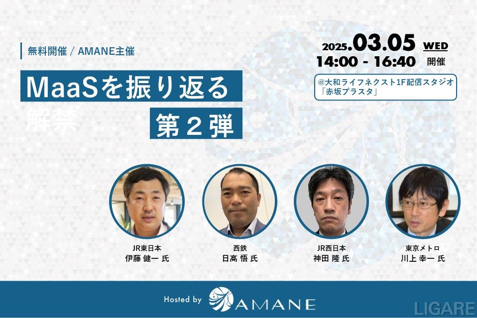 AMANEでは昨年8月にもMaaSをテーマにしたセミナー開催したが、残念ながら台風の影響で完全オンラインでの講演のみとなってしまった。そこで今回は、前回登壇されたJR東日本、JR西日本、西鉄の3社に加えて東京メトロの計4社を会場にお招きし、あらためて鉄道各社が思い描くMaaSの展望をお伺いする。講演に加えてパネルディスカッションも実施するので、前回視聴された方もそうでない方もぜひお越しいただきたい。