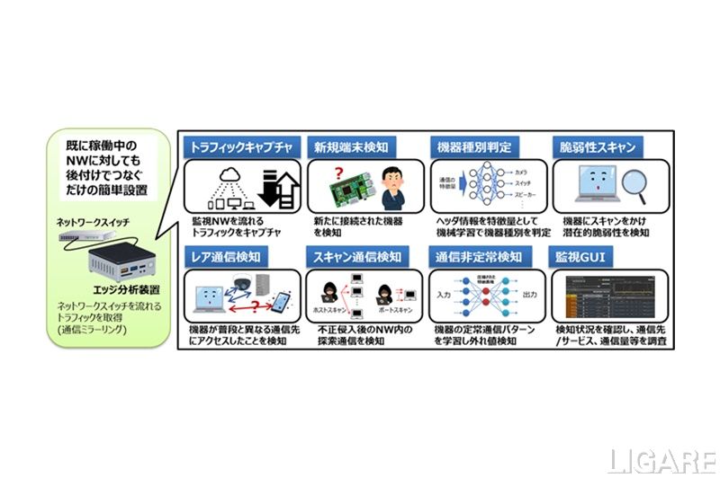 また、OKIは、この共同研究の成果を活用し、エッジ領域のネットワーク機器をリアルタイムで監視するエンジンおよびGUIを備えた「リアルタイムネットワーク監視システム」を開発した。同システムは、ネットワーク内の接続構成や通信状態を可視化し、不審な機器やリスクがあると思われる機器を自動的に抽出する。さらに、これらの機能は、小型かつ軽量な装置単体で提供され、ネットワークスイッチのミラーポートに接続するだけで、すでに運用中のネットワークでも後付け設置で簡単に利用することができる。