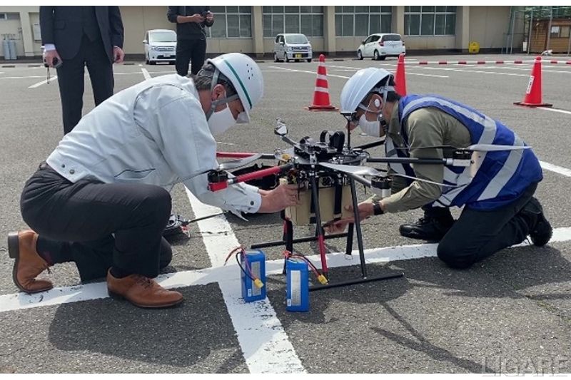 具体的な実験内容としては、災害時など、道路崩落により孤立した集落に、食品や救急・応急用品等の物資をドローンで輸送すると想定し、物資を配送拠点(越前町立ホッケー場)から各中継拠点へ輸送した。今後の実験では、さらに中継地点から孤立集落まで輸送する予定だ。また、ドローンの持続可能な運航を可能とするため、複数のドローンの飛行情報をリアルタイムで閲覧できるシステムを実装し、地域住民の安全を守る施策を行っている。