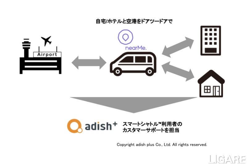 アディッシュプラスは、都内23区と那覇市で提供する空港送迎サービス「nearMe.Airport (エアポートシャトル)」のサポートを担当する。