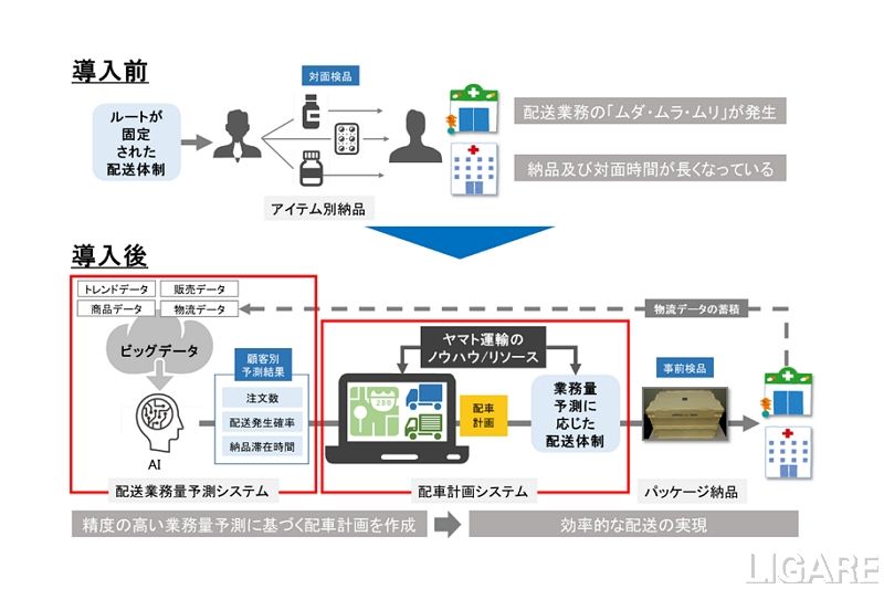 アルフレッサは、これまでに蓄積した「販売」「物流」などのビッグデータをAIで分析し、ユーザーごとの配送業務量を予測し、配車計画を自動的に作成する。配車計画には、ヤマト運輸が蓄積した物流や配車に関するノウハウに加え、渋滞などの道路情報を活用する予定だ。また、デジタル機能の活用による事前検品を増やし、医療機関における対面作業の時間を短縮する。両社の予想では、配送生産性を最大20%向上、走行距離およびCO2排出量を最大25%削減する。医療機関における対面作業時間は、最大20%削減できると予測している。
