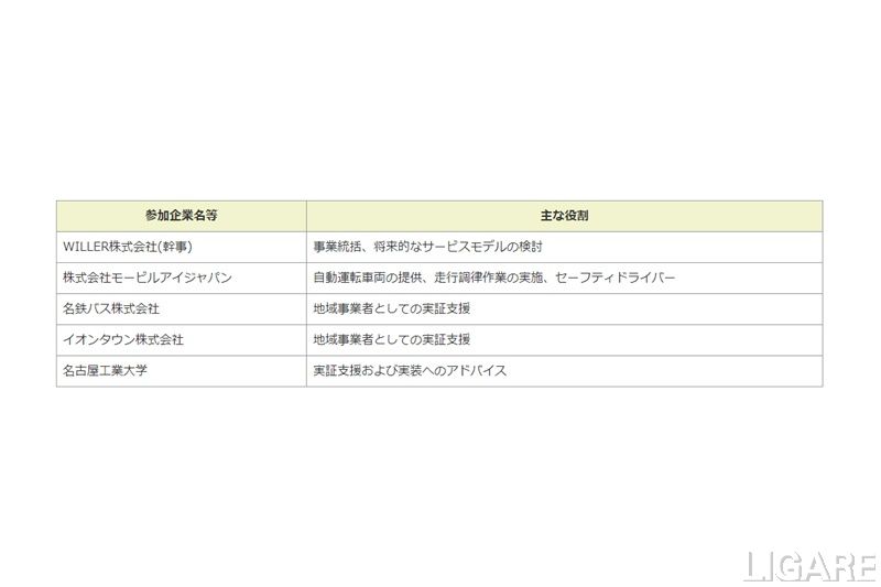 また、同実証は、WILLER株式会社を幹事会社とし、株式会社モービルアイジャパン、名鉄バス株式会社、イオンタウン株式会社、名古屋工業大学の4社、1大学で実施する。
