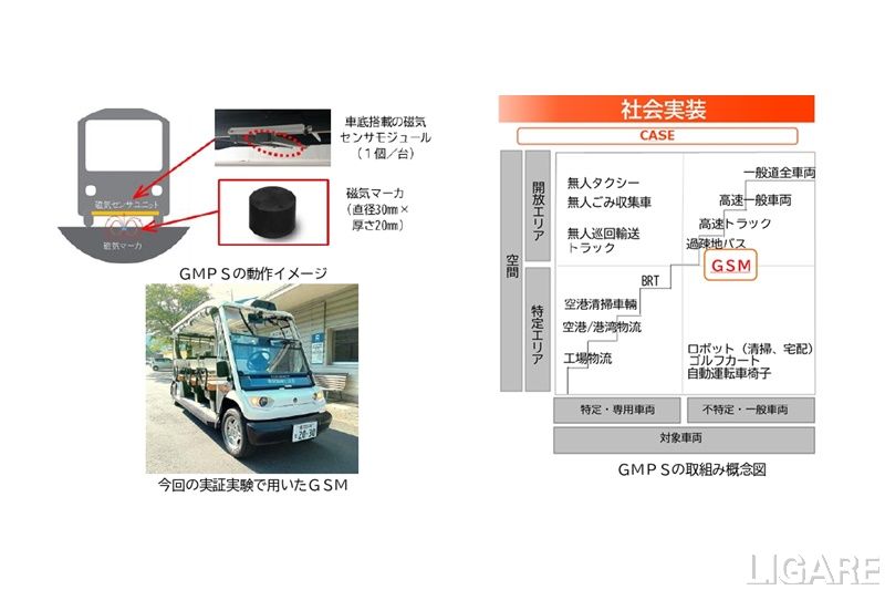 今回の実証では、GNSSを使用せず、走路(片道約1km)に磁気マーカを埋設し、既存のIMU(慣性計測装置)に、新たにGMPSのみをくわえて自動走行した。その結果、目標とする走行経路に対して精度±10cm以内の高い安定性を検証している。なお、愛知製鋼は、今後もGMPSを通じて、安全・安心な次世代モビリティ社会の実現に向けて貢献していくと述べている。