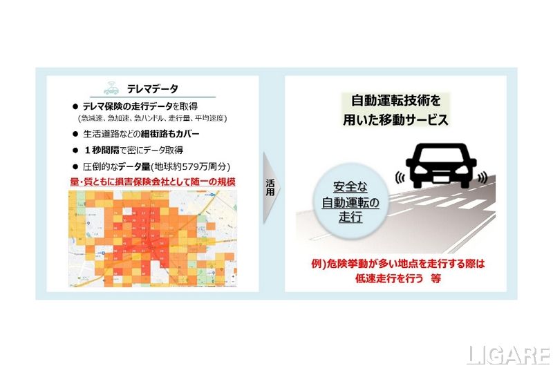 自動運転車両の走行ルート設定では、同社がテレマティクス自動車保険の提供を通じて蓄積した自動車走行データ(急減速、急加速、急ハンドル、走行量、平均速度)を移動サービスで使用する自動運転車両の走行ルート設定に活用する。