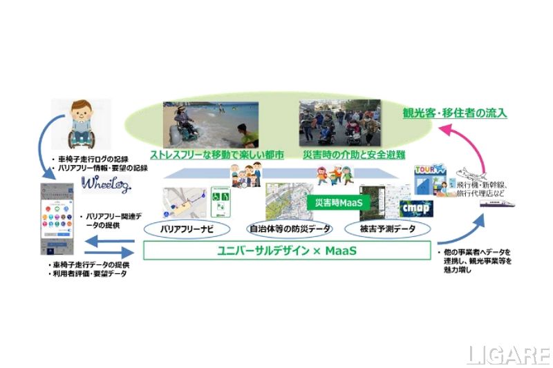 両社は、スマートシティの推進において、バリアフリーマップを生成する「WheeLog!」アプリを通じて得た「車椅子走行データ」と、あいおいニッセイ同和損害保険、または自治体の保有するバリアフリー情報や防災関連データを他のMaaSデータなどと連携しながら相互活用していくことを検討していく。