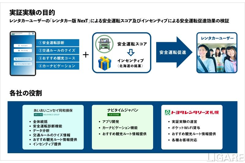 あいおいニッセイ同和損害保険(以下、あいおいニッセイ同和損保)、トヨタレンタリース札幌、ナビタイムジャパンの3社は5月26日、安全運転度合いに応じたインセンティブ提供による事故削減効果を検証する実証実験開始を発表した。