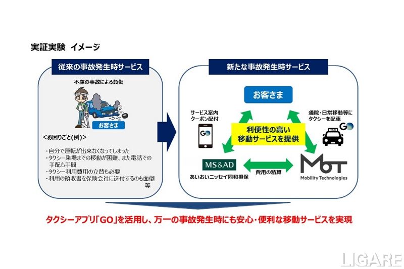 両社は、MoT提供のアプリ「GO」を活用し、事故対応時のサービス提供の実証実験を実施する。万一、ユーザーが不慮の事故で負傷した際等にも、日常移動を担保するスキームの実現に向けた取り組みを開始する。
