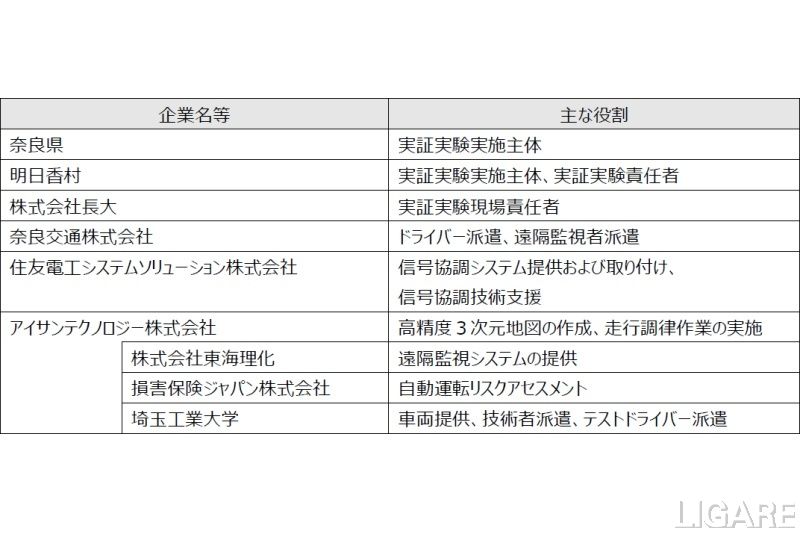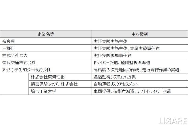 同実証は、株式会社長大、奈良交通株式会社、住友電工システムソリューション株式会社、アイサンテクノロジー、株式会社東海理化、損害保険ジャパン株式会社、埼玉工業大学で実施する。