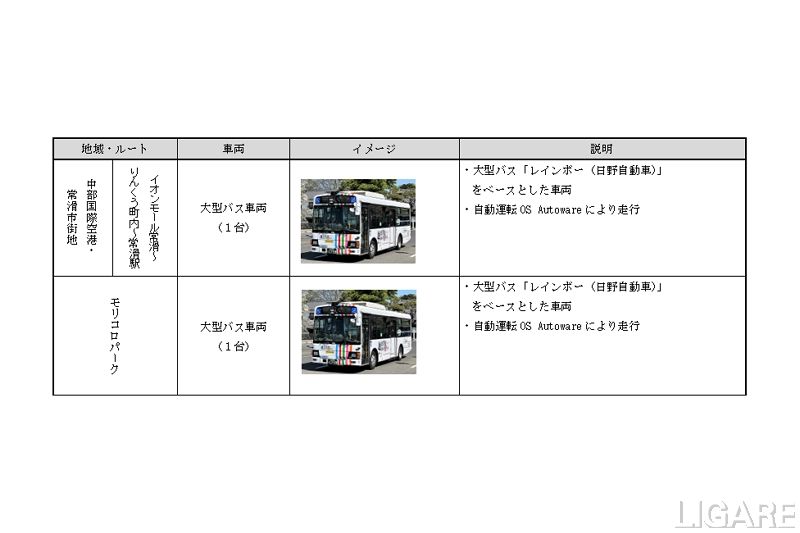 具体的には、中部国際空港島およびその周辺地域では、イオンモール常滑~常滑駅間にて自動運転中型バスを利用した町内自動走行実証を実施する。また、モリコロパーク(愛・地球博記念公園)では、ジブリパーク開業後の園内バスへの自動運転活用を想定した、閉鎖空間における園内目的地への移動手段の実現を目指す。
