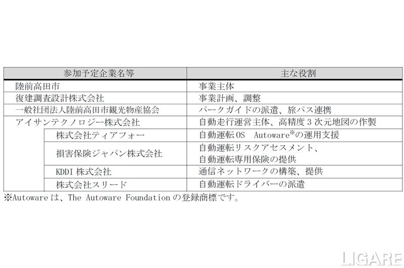 今回の実証は、復建調査設計株式会社(以下、復建調査設計)、一般社団法人陸前高田市観光物産協会、アイサンテクノロジー、株式会社ティアフォー(以下、ティアフォー)、損害保険ジャパン株式会社(以下、損保ジャパン)、KDDI 株式会社(以下、KDDI)、株式会社スリードの7者が、岩手県陸前高田市(以下、陸前高田市)の委託を受けて実施するものだ。
