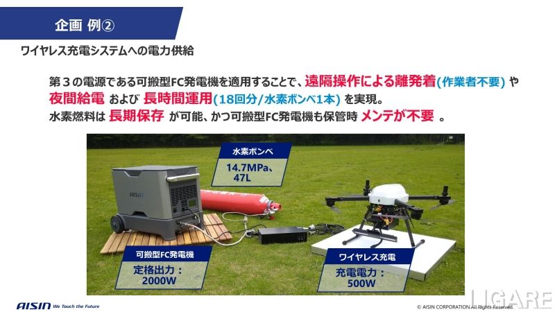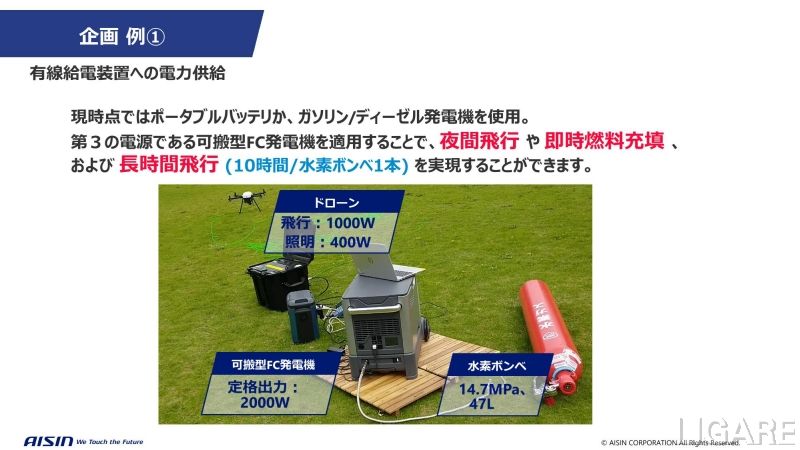 可搬型FC発電機の用途は幅広い。前述したように夜間工事などの静粛性が求められるシーンで優位性があるほか、キッチンカーやキャンプなどのレジャーシーンでの使用が想定されている。また水素燃料はガソリンなどと比べて長期保存が可能であるため、災害発生時などのいざという場面でも信頼性が高い。さらにCO2の排出削減が求められる建設現場などでの活用も期待できる。そのほかに、現在アイシンが取り組みを進めているのが、ドローンとの連携だ。協業パートナーのAutonomyと共同で、有線給電による長時間飛行を実現。従来30分程度しか飛行できなかったドローンを、一般的なサイズ(14.7MPa/47L)の水素ボンベ1本で10時間連続飛行を可能とする。次いで、ドローンのワイヤレス充電システムへの給電も成功しており、夜間照明や遠隔操作といった場面での活用が期待できる。