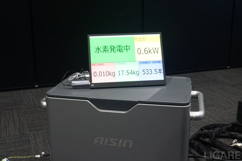 自動車部品大手のアイシンは、カーボンニュートラル社会の実現に向けて「可搬型FC発電機」を開発している。トヨタの燃料電池車・MIRAIや、家庭用燃料電池・エネファームに用いた技術を応用し、小型・軽量・静粛性を実現した製品だ。
