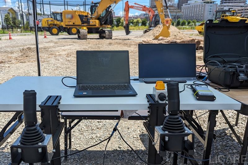 ARAVが提供する遠隔操作の装置「REMOTE CONTROL Model V/E」は、油圧ショベルやホールローダーなど、レバー操作の建設機械なら種類やメーカーを問わず後付け可能。市販されている建設機械の84%(ARAV調べ)に適合する。装置は運転席の背面に取り付け、ノートパソコンやスマホ、タブレットとコントローラーを組み合わせて遠隔操作を行う。コントローラーは、デスクにも簡単に取り付けられ、操作員の環境に応じて配置できる。装置を付けたまま運転席で操作することもでき、有人・無人を切り替えての作業にも対応している。