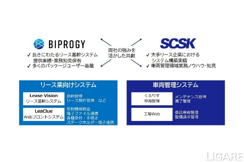 今回の協業検討は、BIPROGYが保有するリース事業者向け基幹システム分野とSCSKが得意とするオートリース車両管理・メンテナンス分野との融合により、幅広いリース事業者ニーズに応えるソリューションの拡充が可能になると判断したためとのことだ。