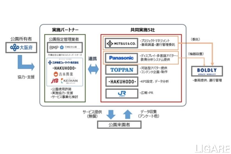 三井物産、パナソニック、凸版印刷、博報堂、JR西日本は、万博記念公園マネジメント・パートナーズと共に、万博記念公園にて自動運転車両を活用した次世代型モビリティサービス「EXPOオートライド&ガイド(仮称)」の実証試験を共同で実施する。