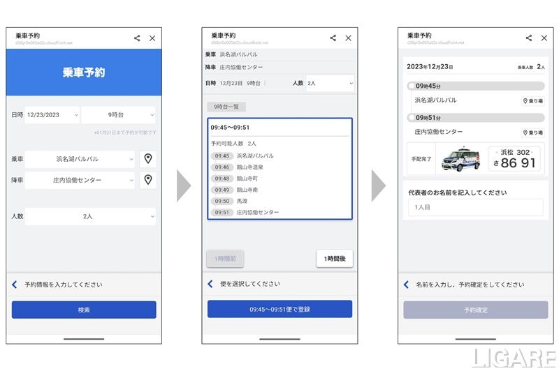 また、後部座席に設置したタブレット型の車内HMIには、「Dispatcher」と連携した案内システムを搭載している。このため、乗客は、現在地や行き先を確認できるほか、緊急時に遠隔監視者との通話も可能だ。さらに、同実証では、BOLDLYが開発した、LINEで利用できる予約システムによる事前予約制の運行とすることで、確実に乗車できる仕組みを整えているという。