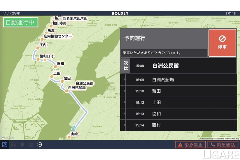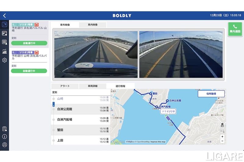 「浜松自動運転やらまいかプロジェクト」は、浜松市、スズキ株式会社、遠州鉄道株式会社、およびBOLDLYで実施しているものだ。BOLDLYは、同プロジェクトにおいて、「Dispatcher(ディスパッチャー)」や、LINEで利用できる予約システムやルートなどを案内する車内HMI(ヒューマン・マシン・インターフェース)を提供。これにより、遠隔地から安全な運行を見守ると共に、乗客が快適かつスムーズに目的地まで移動することを目指している。
