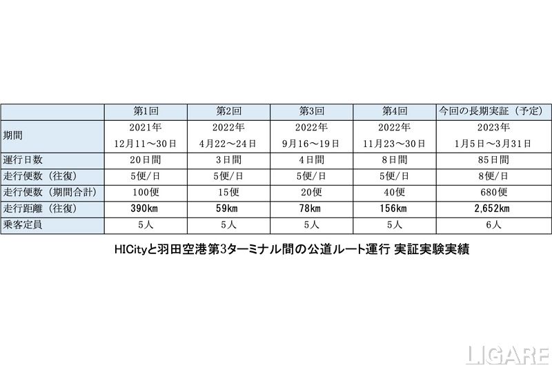 今回の実証は、自動運転バスを高頻度で毎日運行(8便/日)させ、定常運行に近い利用環境で2023年1月5日~3月31日に実施している。同バスは事前予約制で、誰でも無料で乗車可能だ。これらの実証実験では、一般利用者に、HICityと羽田空港を結ぶ公道ルートを時刻表に沿って運行する自動運転バスに乗車してもらっている。2023年2月27日時点で累計88日、599便を無事故で運行中だ。