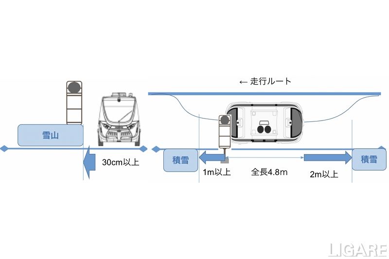 くわえて、BOLDLYは、2023年2月に実施した運行ルート上での試験走行で、積雪後の道路環境を整備した結果、信号がある交差点を除いた区間において、車内のオペレーターがコントローラーを一切操作しない「無介入」※ での自動走行を達成した。さらに、3月に入り気温が上昇したことで、融雪により大きな水たまりができたり路面が滑りやすくなったり、路肩に除雪した雪が車道に崩れ落ちたりするなどの環境の変化を確認している。今回の試運行では、そのような環境下でも安定して走行するために、環境変化に応じて道路環境を整備するという。