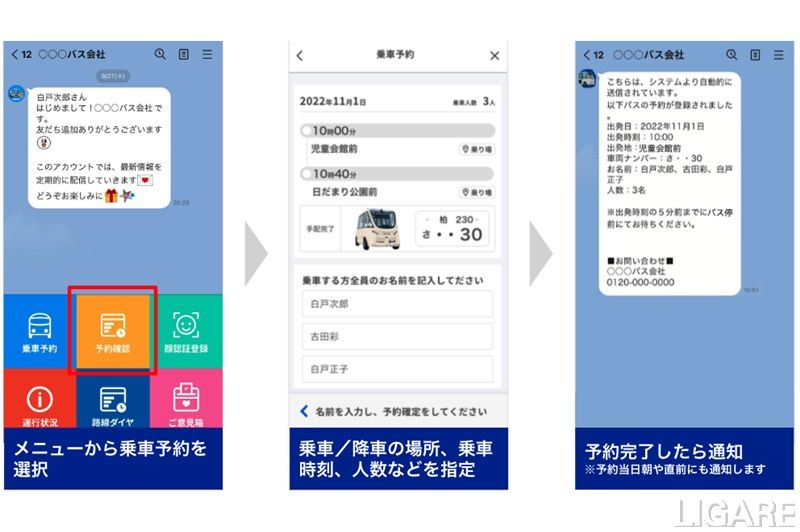 くわえて、「LINEバス予約」では、配車予約と定期便乗車予約を提供している。配車予約では、指定したバス停・時刻にバスが自動で配車される機能だ。一方、定期便乗車予約では、定常運行しているバスの乗車予約ができる。乗りたいバス停と降りたいバス停、乗車したい便を選んで予約すると席を確保することが可能だ。