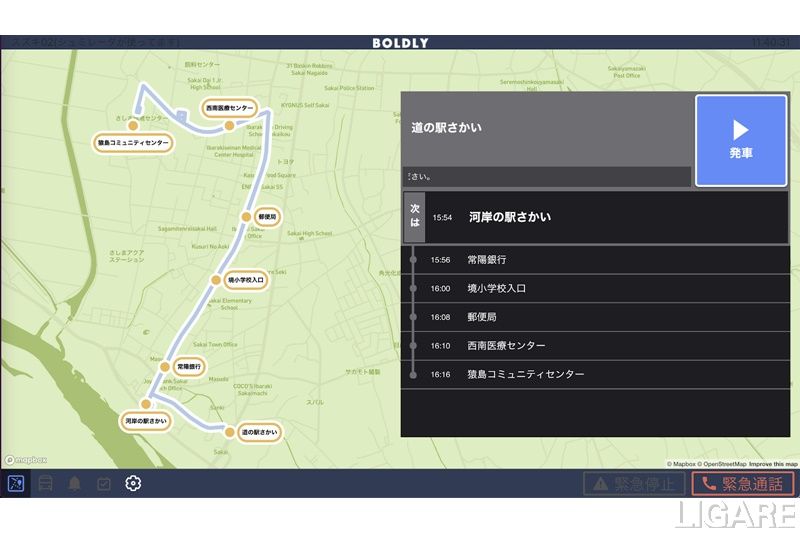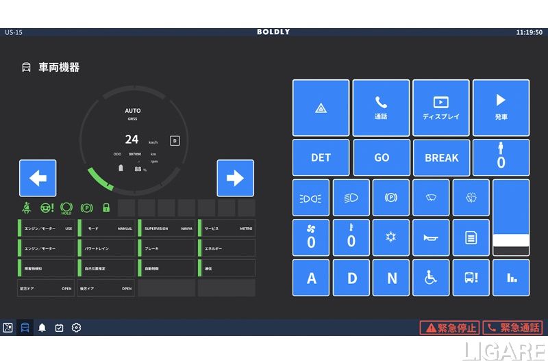 また、「Dispatcherダッシュボード」には、バスの走行ルート、停車するバス停、到着予定時刻などを乗客向けに表示したり、乗務員がタッチパネル操作により遠隔監視室に発信して通話するなど、車内で必要とされる機能を備えている。これにより、乗務員はキーボード操作をすることなく、運転操作と車内案内業務をシームレスに行うことができる。