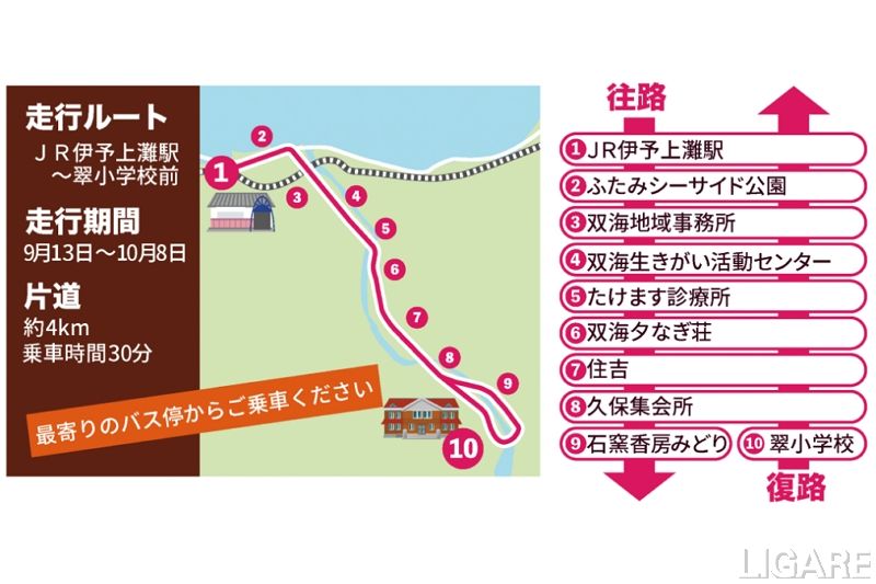 移動サービスでは、JR伊予上灘駅を起点とした1周約8kmのルートにおいて「NAVYA ARMA」を運行する。ヘルスケア分野では、高齢化や過疎化が進む伊予市双海地域の希望者に対して、ヘルスケアテクノロジーズ株式会社の協力の下、ヘルスケアアプリ「HELPO」とスマートウォッチ「Fitbit」を提供する。「HELPO」は健康医療相談サービスなどの利用が可能で、「Fitbit」は健康管理機能を備えている。