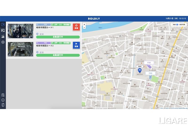 ⼀部の交差点では、信号協調で、「NAVYA ARMA」が信号機の色などの情報を取得し、信号を通過するタイミングを⾃動で判断して⾛⾏する。さらに、「乗務員がいないバス」の実現に向けて、岐⾩市役所内に設置したBOLDLYの⾃動運転⾞両運⾏プラットフォーム「Dispatcher(ディスパッチャー)」を利⽤する。これにより、⾃動運転バスの運⾏状況や⾞内の様⼦の遠隔監視や、乗⾞運賃のキャッシュレス決済を⾒据えた顔認証による乗客の確認と擬似決済の実験を⾏う。