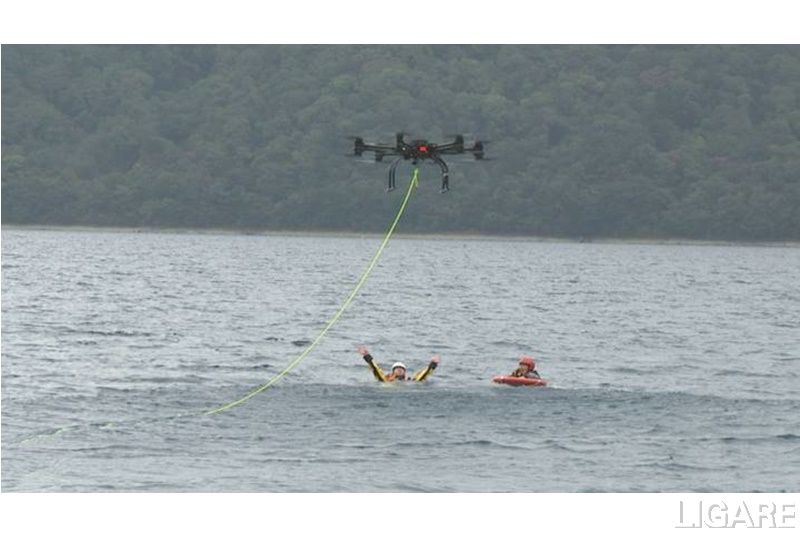 「医療・災害」では緊急時に陸上輸送が困難な場面を想定した医薬品搬送やドローンで水に浮かぶ救助用ロープや浮輪、20kgとなるブイを投下し消防隊との水難救助共同訓練を行った。