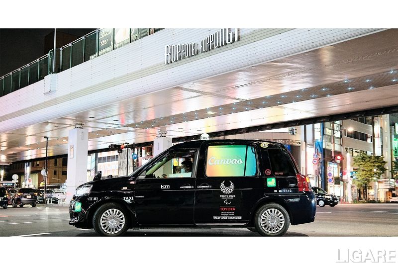 「Canvas」は、都内を走行するタクシー車両の空車時間を活用して、後方のサイドガラスに広告を映し出す国内初の車窓モビリティサイネージサービスだ。5月31日よりJPN TAXIの100台で運用を開始し、S.RIDE加盟のタクシー事業社が保有するJPN TAXI全てに搭載していくという。