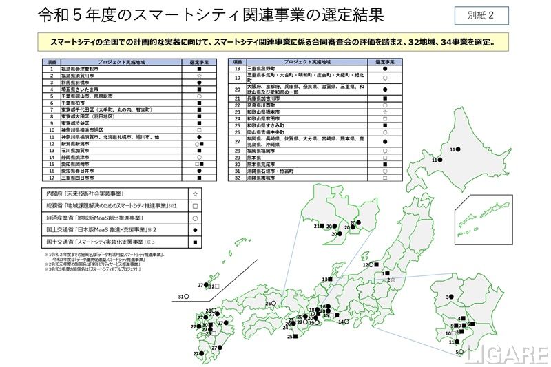 内閣府・総務省・経済産業省・国土交通省は6月30日、スマートシティの全国での計画的な実装に向けた取り組みの一環として、令和5年度スマートシティ関連事業に関して、32地域、34事業を選定した。