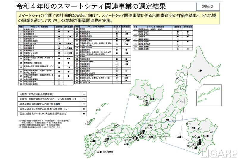 内閣府・総務省・経済産業省・国土交通省は、2022年度のスマートシティ関連事業として、51地域、54事業を選定した。7月13日付のプレスリリースで明かしている。