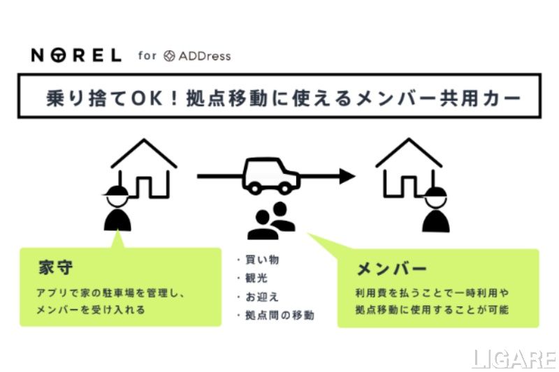 この実証実験では、NORELがシェアリング可能な車両を、ADDressの複数拠点の住居へと提供する。期間中は、ADDressの住民は無料でクルマを利用することができ、ADDressの一部拠点同士での「乗り捨て」も可能となる。実証期間は2020年2月12日から2020年3月31日まで。