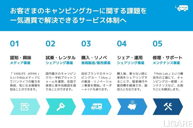 Carstayは、キャンピングカーの旅行者向けに、空き地や空き駐車場などを車中泊ができるスペースとしてシェアするサービスを2019年1月より提供してきた。さらに、キャンピングカーに特化したカーシェアのプラットフォーム・サービスの提供を2020年6月より開始。キャンピングカーなど車中泊仕様の車の自作や維持管理などができる「Mobi Lab.」を2022年10月に開設している。