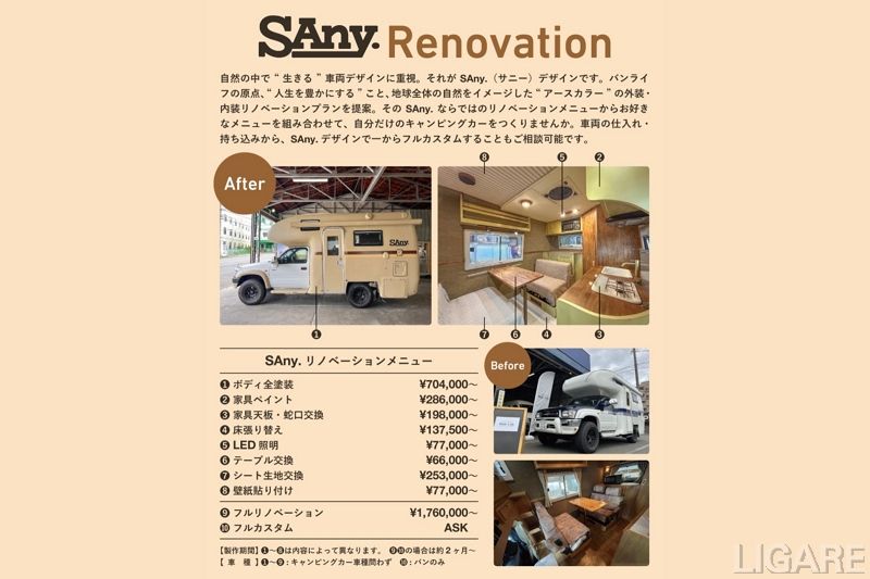 また、Carstayの独自ブランド「SAny(サニー).」では、「フルカスタム」、「フルリノベーション」などのサービス含む「SAny.リノベーション」の受注を開始する。「フルカスタム」は、新・中古車両の仕入れ、ユーザーが持ち込んだ車両をキャンピングカーまたは車中泊仕様に改造するというものだ。一方、「フルリノベーション」では、中古や旧式キャンピングカーの外装や内装のデザインを改修する。さらに、購入後もカーシェアでの維持費軽減や「Mobi Lab.」での管理・修理などのサービスの提供が可能だ。