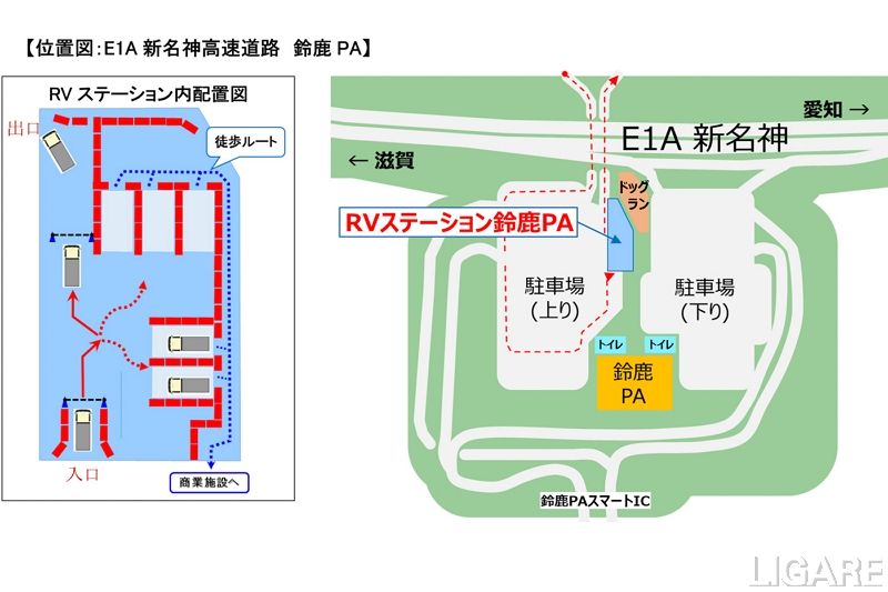 同事業は、Carstay、中日本高速道路株式会社(以下、NEXCO中日本)、中日本エクシス株式会社(以下、中日本エクシス)の3社で実施する。「RVステーション鈴鹿PA」は、E1A新名神高速道路(新名神)鈴鹿パーキングエリア(上り、三重県鈴鹿市)の駐車場に直結している。高速道路のPAからそのまま利用できる車中泊スポットの設置は、全国で初めての試みだ。
