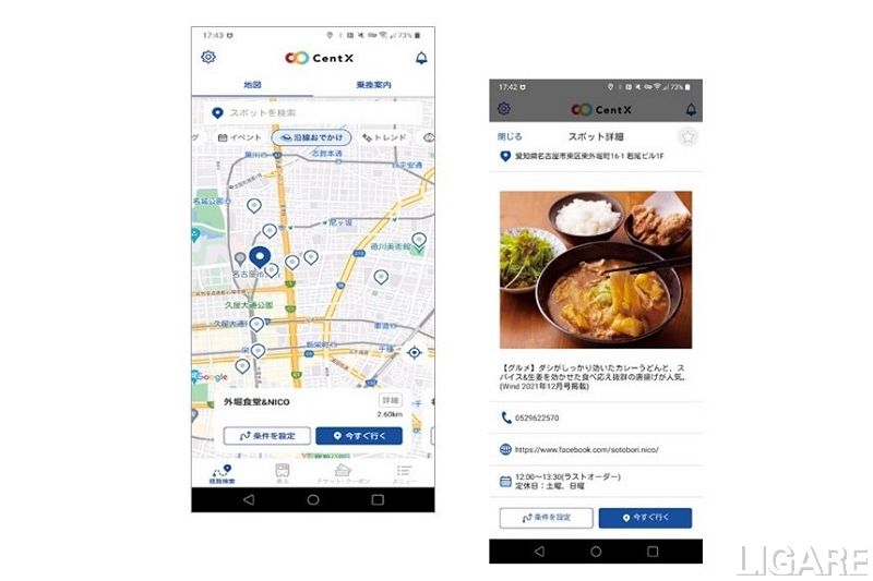また、同アプリは、株式会社ジザイめっけが提供する「地図と連動した地域情報発信アプリ MEQQE(めっけ)」のスポット情報とのAPI連携を10月末から開始する。これにより、CentXアプリ上で「経路検索」から「地図」を押下した際に、地図上に表示されるスポット情報が拡充される。