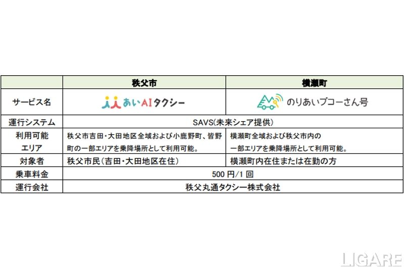 また、横瀬町では、既存のAIデマンドタクシー「のりあいブコーさん号」に、秩父市内の乗降場所を追加する(2023年2月以降順次追加予定)。両サービスが互いに連携し合う形で運用を行うことで、交通・物流課題解決に向けた生活インフラの強化を目指す。