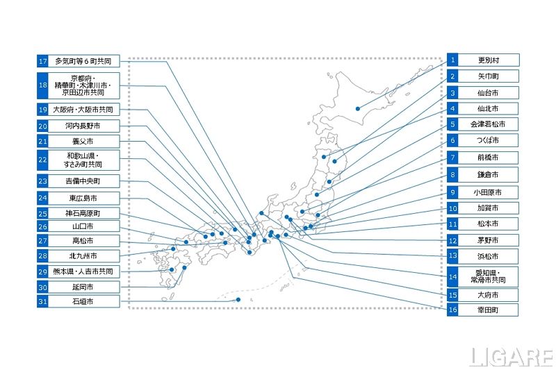 北海道更別村、岩手県矢巾町、宮城県仙台市、秋田県仙北市、福島県会津若松市、茨城県つくば市、群馬県前橋市、神奈川県鎌倉市、神奈川県小田原市、石川県加賀市、長野県松本市、長野県茅野市、静岡県浜松市、愛知県・常滑市共同、愛知県大府市、愛知県幸田町、三重県多気町等6町共同、京都府・精華町・木津川市・京田辺市共同、大阪府・大阪市共同、大阪府河内長野市、兵庫県養父市、和歌山県・すさみ町共同、岡山県吉備中央町、広島県東広島市、広島県神石高原町、山口県山口市、香川県高松市、福岡県北九州市、熊本県・人吉市共同、宮崎県延岡市、沖縄県石垣市