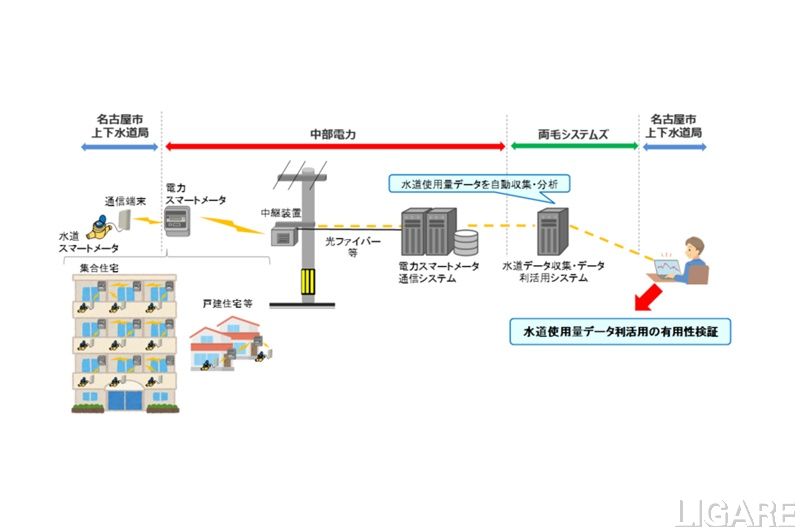 今回の協定には、名古屋市上下水道局(以下、上下水道局)、中部電力、株式会社両毛システムズ(以下、両毛システムズ)が締結している。さらに、上下水道局と中部電力は、2021年5月6日公表済の電力スマートメータ通信網を活用した集合住宅における水道自動検針の試験導入において、高いデータ取得率を確認している。